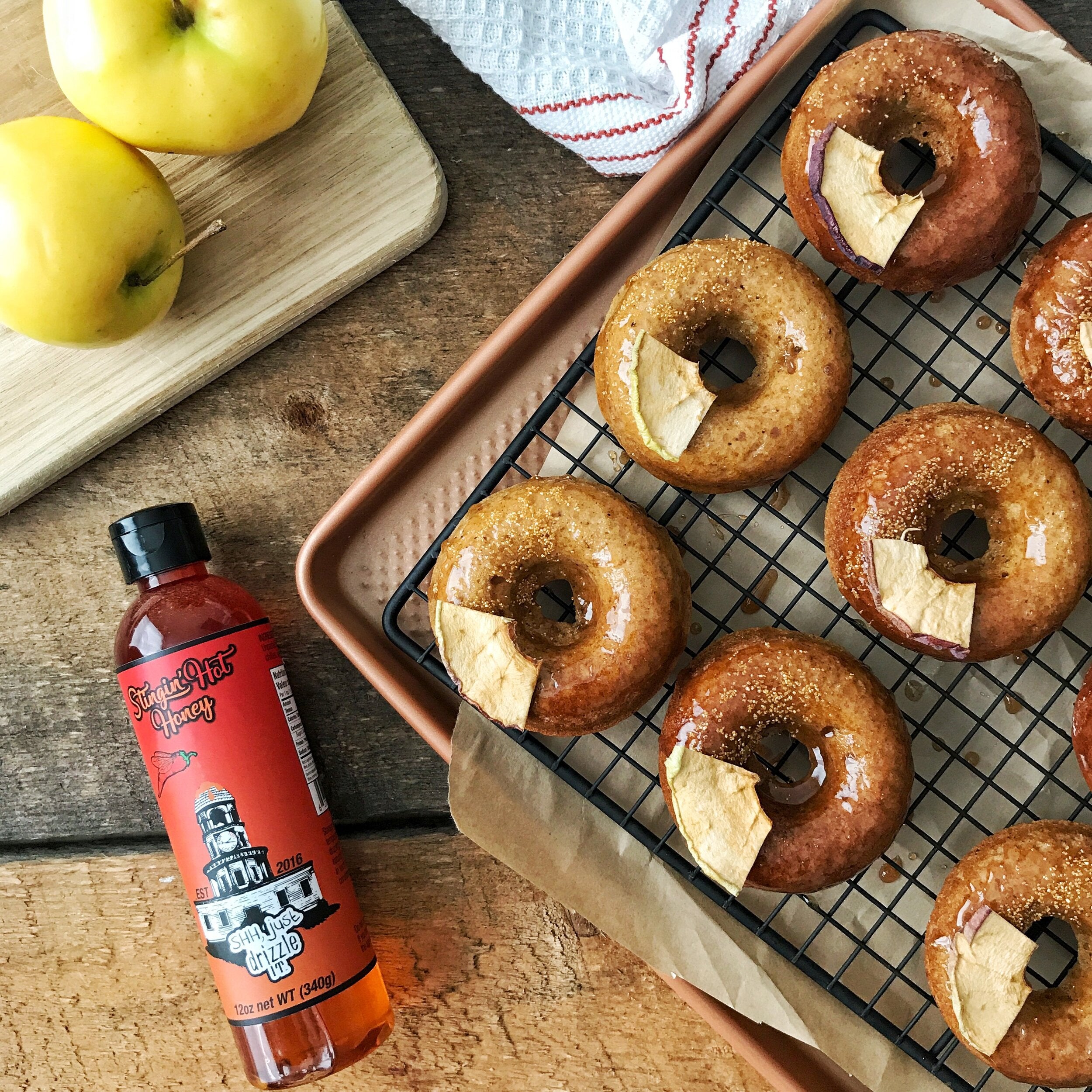 These baked donuts are perfectly moist, perfectly sweet and have a touch of heat from Stingin’ Hot Honey. The SHH Caramel glaze is finger licking good and puts these donuts over the top.
