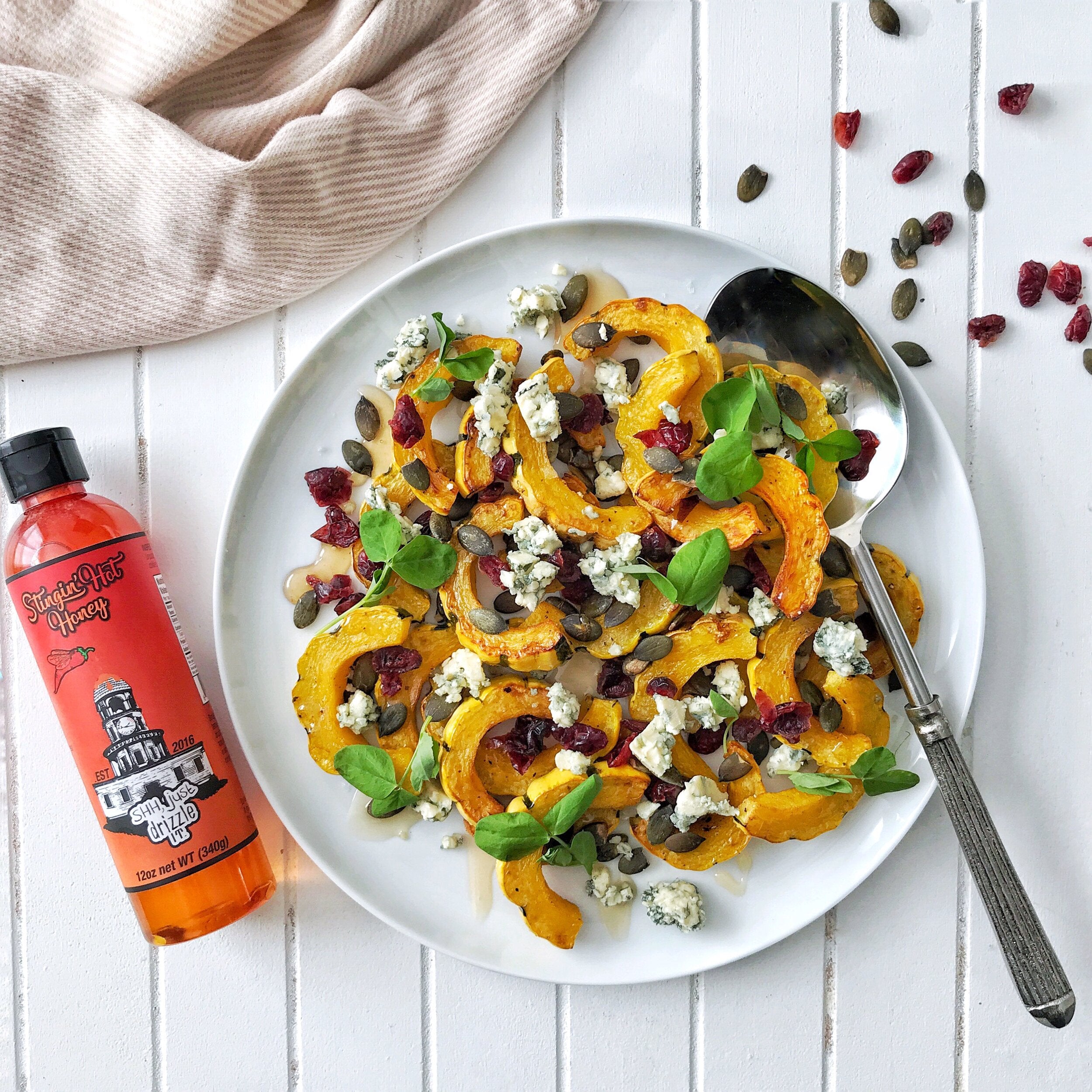 Preheat oven to 425’f. In a large bowl, whisk together oil, 1 Tbsp honey, a healthy pinch of salt and pepper. Toss squash well, until coated. Lay out on a single layer on a parchment lined or well oiled baking sheet. Roast for 15-20 minutes, flipping once, until soft and golden. Remove from oven, allow to cool slightly, arrange on a platter, top with cheese, seeds and cranberries, drizzle with LOTS of SHH. Season. Top with greens, serve immediately. Enjoy!