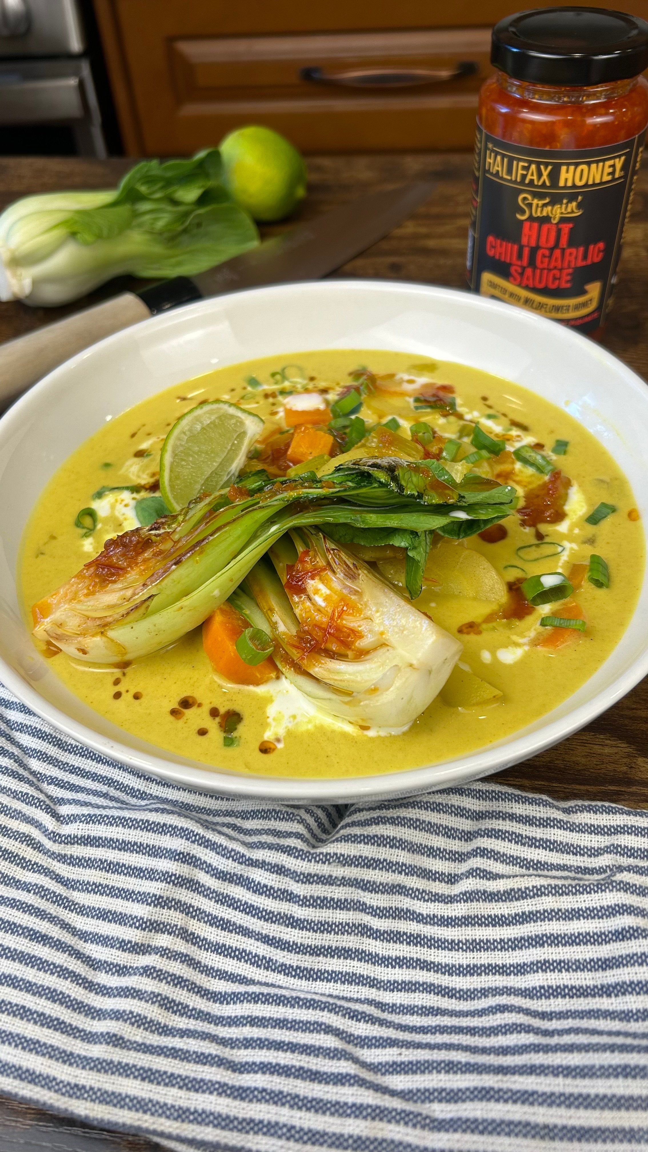 - While the soup is simmering, make a chili oil by combining 1 teaspoon of Stingin Hot chili garlic sauce with ¼ cup of olive oil, and soy sauce.